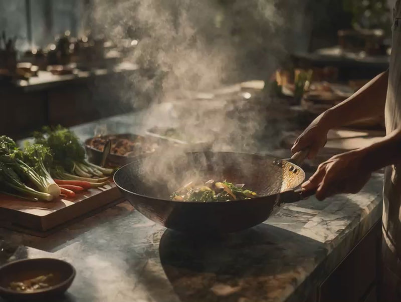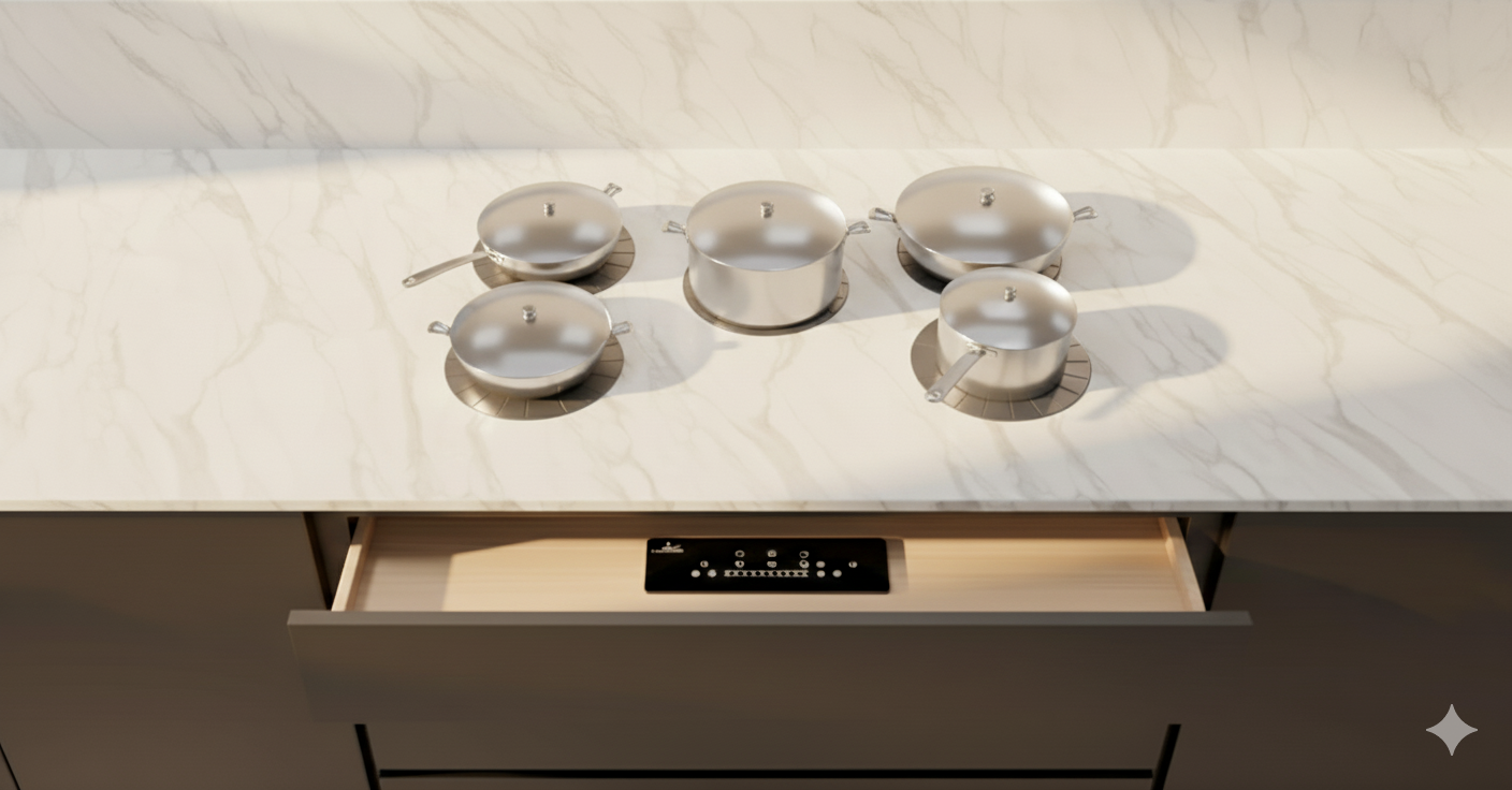 There are no bulky burners or cooktops on the counter. The surface remains a clear, uninterrupted workspace, even when in use.